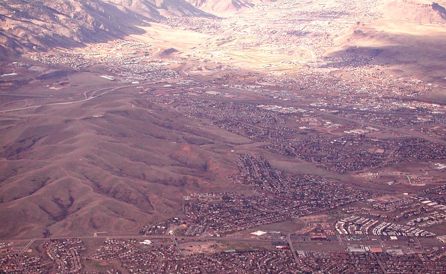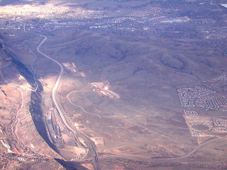 South view of Green Mountain, Bandimere drag strip, Dinosaur Ridge (aka Hogback)